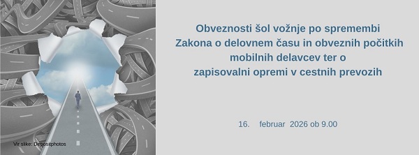 Z uveljavitvijo novih določb Zakona o spremembah in dopolnitvah Zakona o delovnem času in obveznih počitkih mobilnih delavcev ter o zapisovalni opremi v cestnih prevozih (ZDCOPMD-I) (Ur. l. RS št. 32/25), so bile tudi za učitelje vožnje uvedene spremenjene obveznosti glede uporabe voznikove kartice, vodenja evidenc, obveščanja in hrambe tahografskih podatkov. S ciljem zagotavljanja skladnosti dela učiteljev vožnje in izpopolnjevanja znanja, potrebnega za usposabljanje bodočih voznikov, v okviru Združenja šol vožnje Slovenije, organiziramo usposabljanje za učitelje vožnje in predpisov, ki morajo predpisane obveznosti poznati za učinkovito izvajanje delovnih nalog. Usposabljanje je namenjeno poglobljenemu razumevanju obveznosti povezanih z uporabo tahografov ter pripadajočega zakonodajnega okvira. Poseben poudarek bo namenjen praktičnemu prikazu uporabe tahografa, ki bo izveden na simulatorju tahografa, kar udeležencem omogoča neposreden vpogled v delovanje sistema in obravnavo konkretnih primerov iz prakse. Pridružite se nam v ponedeljek 16. februarja 2026, od 9.00 do 12.00 ure, v dvorani F (medetaža) Gospodarske zbornice Slovenije, Dimičeva ulica 13, v Ljubljani.